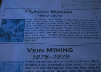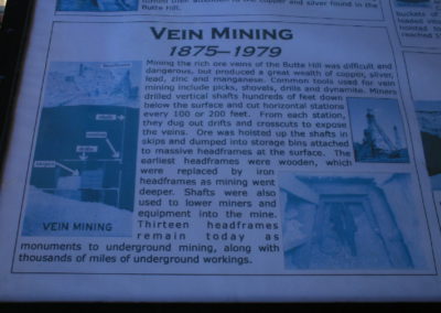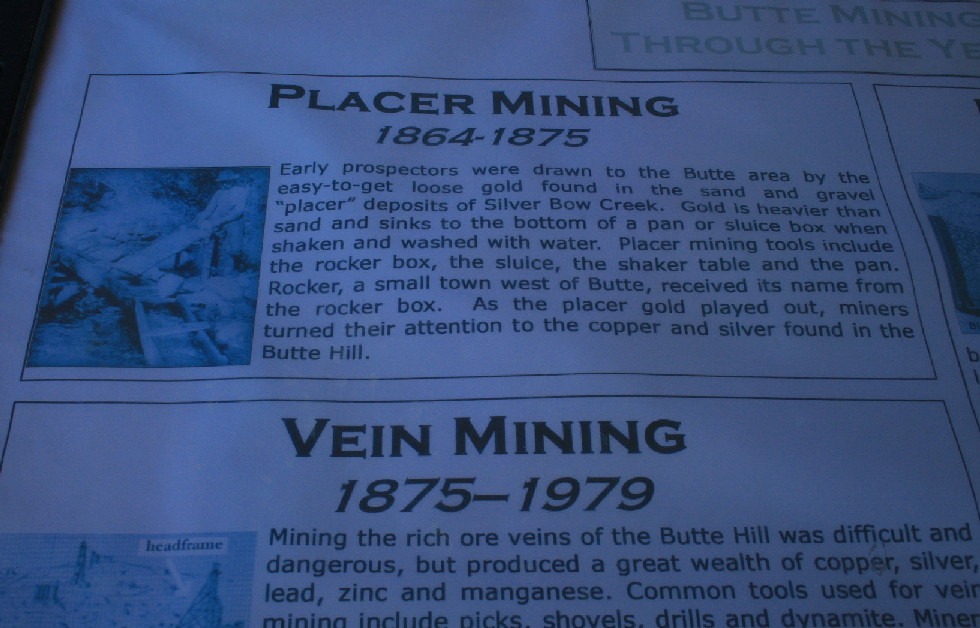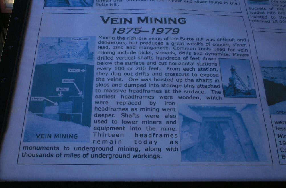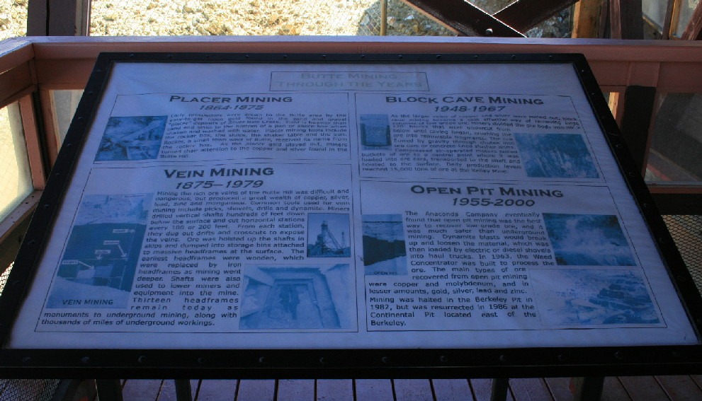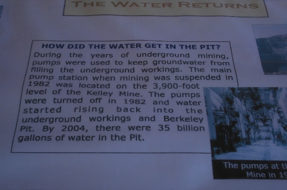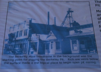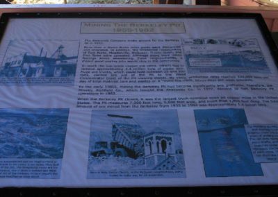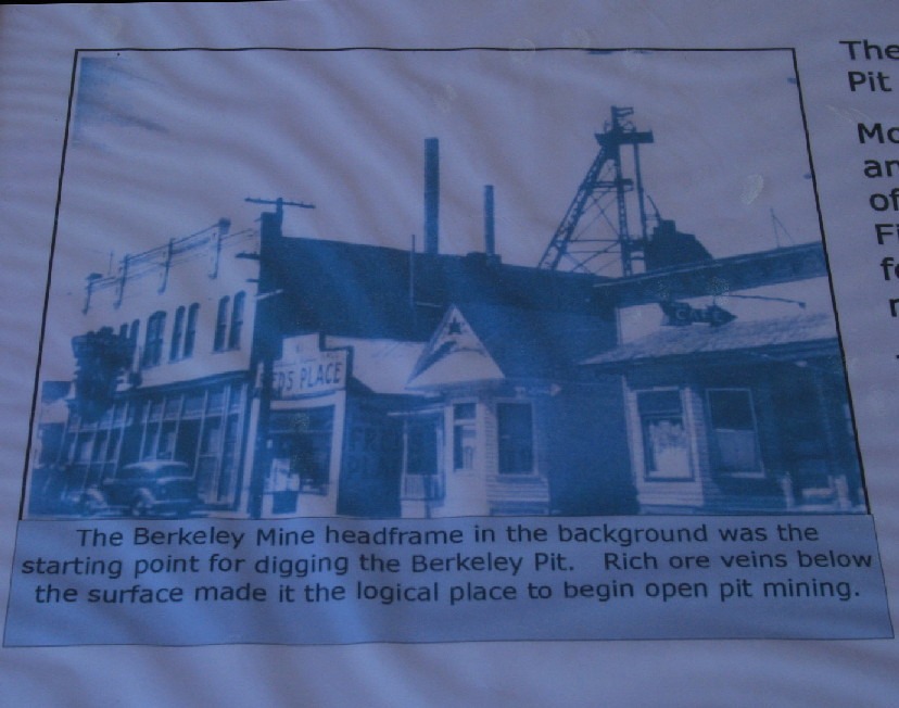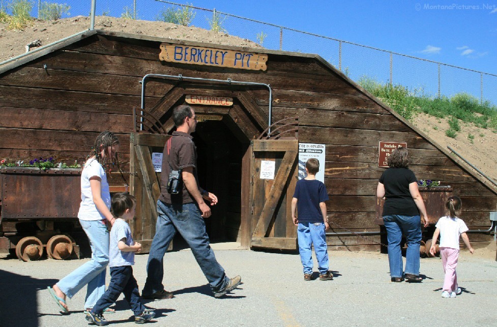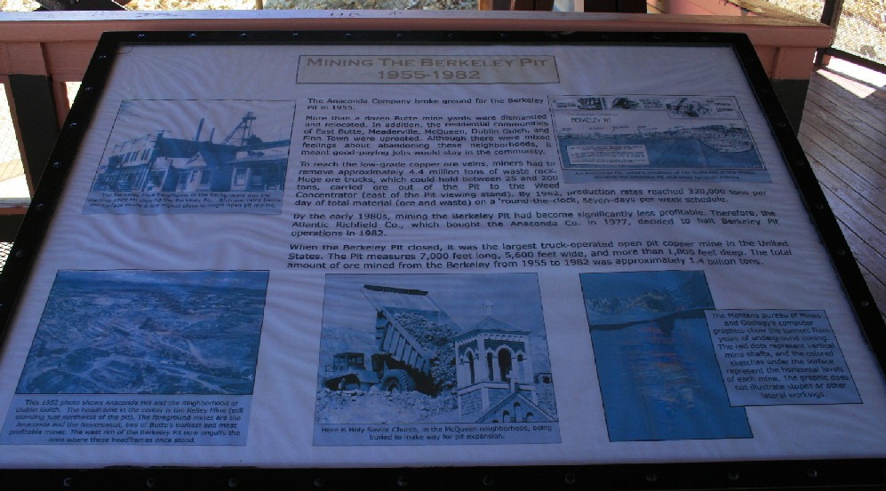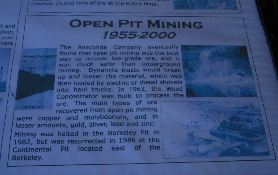 The Berkeley Pit is a former open pit copper mine begun in 1955. It is one mile long by half a mile wide with an approximate depth of 1,780 feet. The pit is named for the Berkeley Mine, once a famous lode-mining producer in the Meaderville area. Mining was halted in the Berkeley Pit in 1982 but was resurrected in 1986 at the Continental Pit located east of the Berkeley. The main types of ore recovered from open pit mining are copper and molybdenum and in lesser amounts, gold, silver, lead and zinc. Moly-what?
