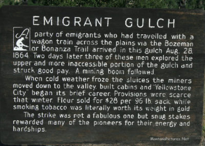Jim Bridger (the famous scout and mountain man) wintered with the Crow Indians near Emigrant in 1844-45. In the three decades after Lewis and Clark, this area as well as much of the mountain west was actively trapped by hundreds of men, primarily for beaver. In the decades starting 1840 and 1850, the trapping activity largely ceased because of lack of beaver demand due to the changed styles and the country being trapped out. Gold was discovered in Emigrant Gulch in 1863. By the fall of 1864, several hundred men were working claims there. When winter came, 75 log huts were built at the mouth of the gulch and the town named Yellowstone City.
