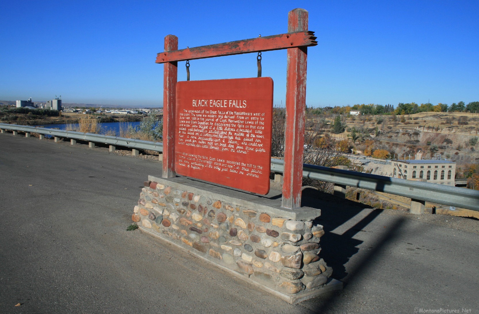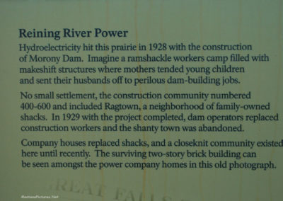 The “Black Eagle Dam” – Built in 1890. Across the Missouri river nothing remains of the 506-foot-high “Big Stack” that dominated the Great Falls skyline and economy for more than 80 years (1893-1980). The popular central Montana landmark was removed in 1982. All the numerous industrial buildings that dotted the hillside above “Black Eagle Dam” were gone by 1997.