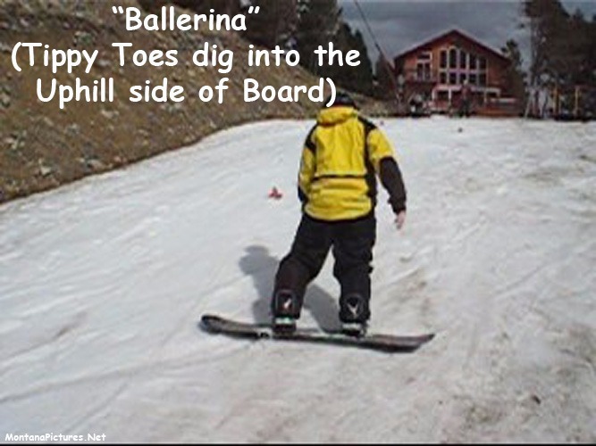 If you decide to slide in the “Ballerina” position, press your toes hard, on the UP-Hill edge of your board. If you don’t maintain your weight over your toes or heels you open the possibility that the DOWN-Hill edge will dig into the snow and YOU WILL FALL.