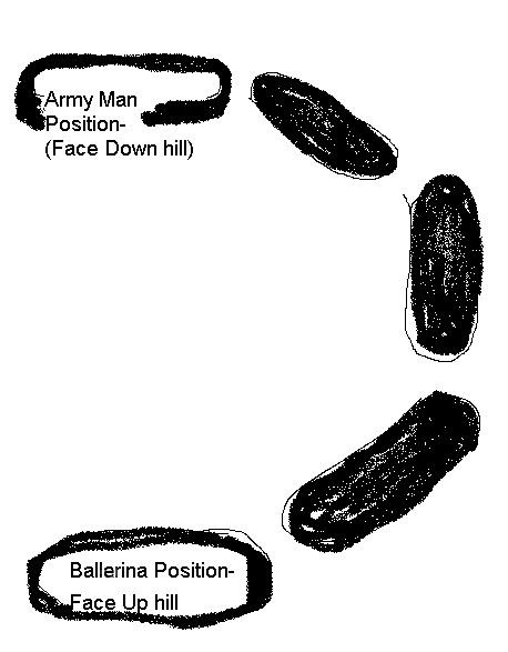 Remember, no matter what position you choose commit yourself. If you decide to slide in the “Army Man” position, press your heels hard, on the UP-Hill edge of your board.