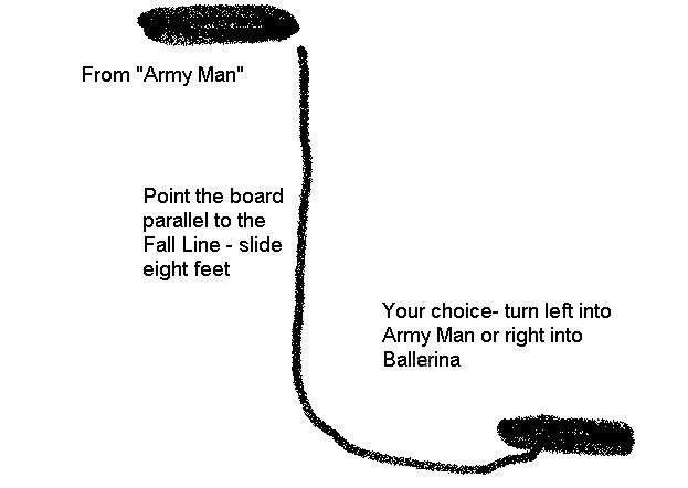 Starting in the “Ballerina” position, you will force your board to change position from perpendicular to the “Fall Line” to straight down the “Fall Line” then back to perpendicular to the “Fall Line,” Once your board is back to perpendicular to the “Fall Line” you will be facing down-hill in the “Army Man” position.