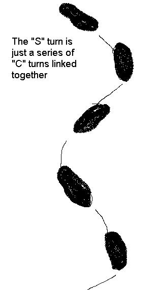 The last & best snowboard “turn” is the Letter “S” turn. Why? because after a day or two of “J” turns, you begin to feel the urge to link the turns together. Even though the carve lasts a mere second or two the UP-Hill edge of our board is always in contact with the snow except for the split-second of switching from the “Army Man” position to the “Ballerina” position.